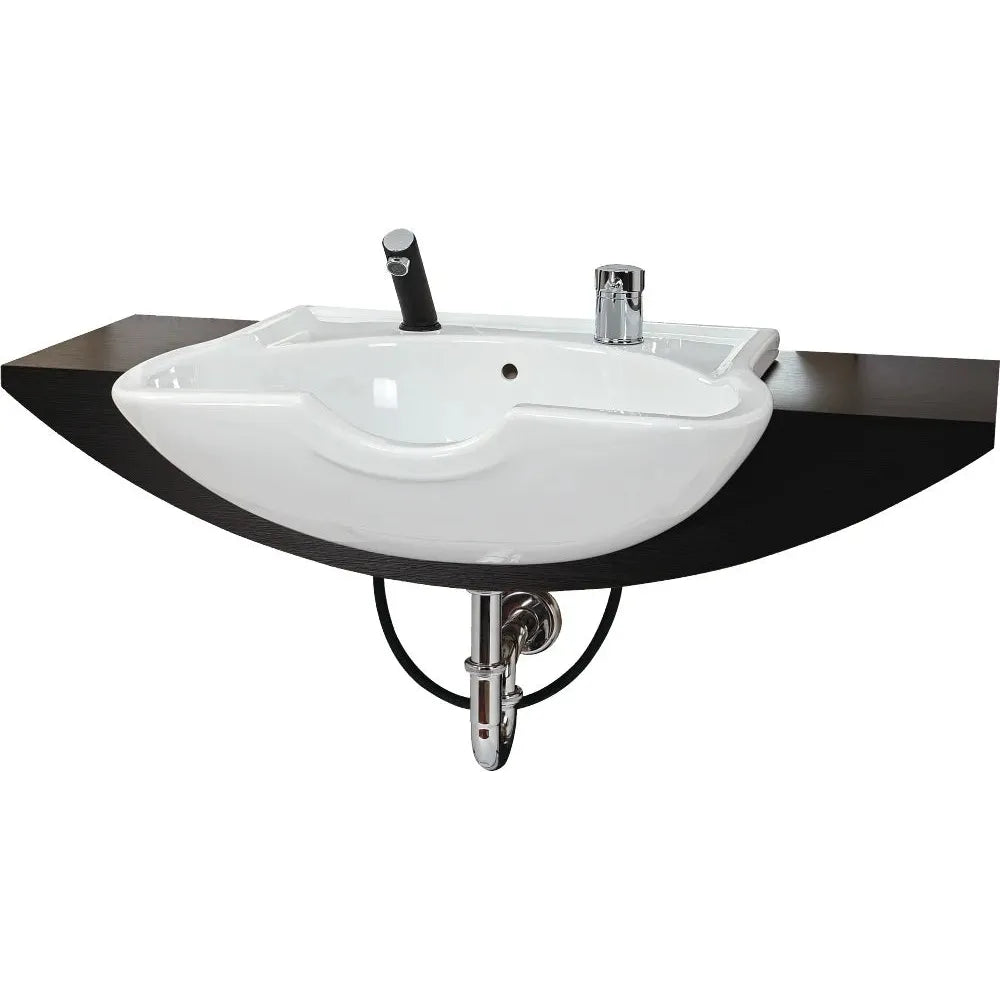 Der Friseurwaschplatz ist mit einer Holzablage ausgestattet, die Sie mit einer Halterung an der Wand befestigen können. Sie können aus verschiedenen Laminaten/Farben aus der Kollektion des Herstellers wählen. Sie können sich auch für ein weißes oder schwarzes Porzellanwaschbecken entscheiden, das mit einer AquaPLUS-Einhandbatterie inklusive Handbrause ausgestattet ist.