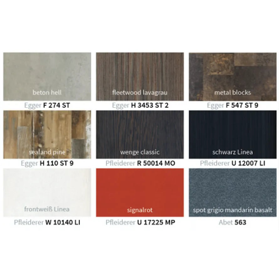 - Frontwaschbecken in Weiß oder Schwarz inklusive Ablage in verschiedenen Laminaten, wählbar aus der Kollektion des Herstellers