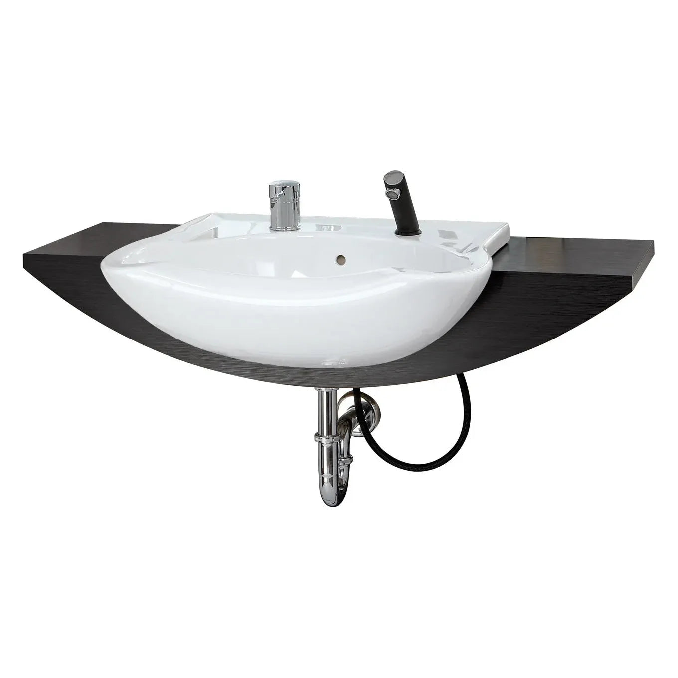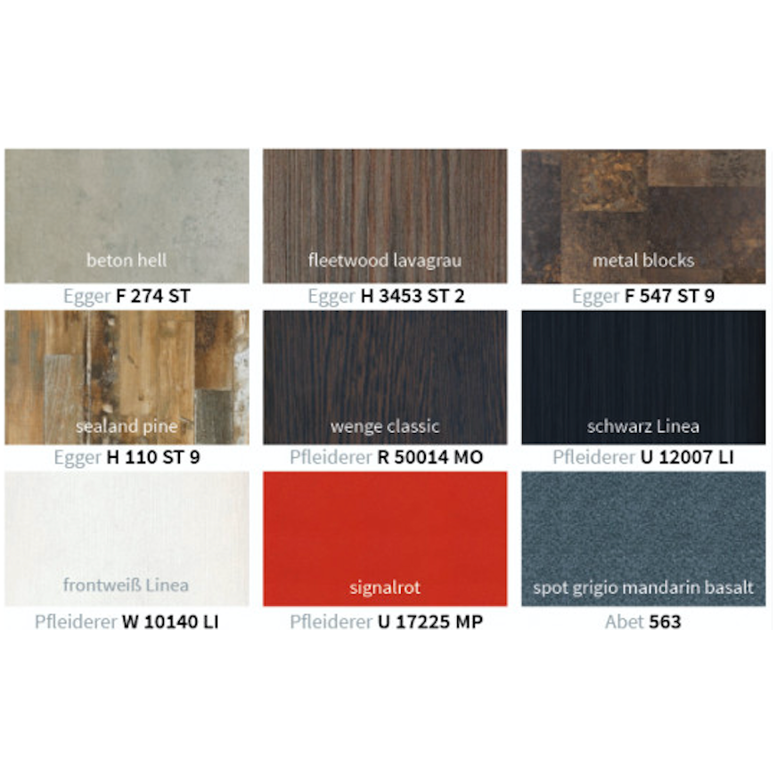 - Frontwaschbecken in Weiß oder Schwarz inklusive Ablage in verschiedenen Laminaten, wählbar aus der Kollektion des Herstellers