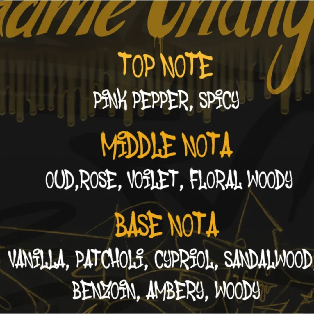 Orientalischer Oud-Herrenduft: Kopf – Rosa Pfeffer – Würzige Herznote – Oud, Rose, Lila – blumig-holzige Basisnote – Vanille, Patschuli, Cypriol, Sandelholz, Benzoe – Ambra, Holzig
