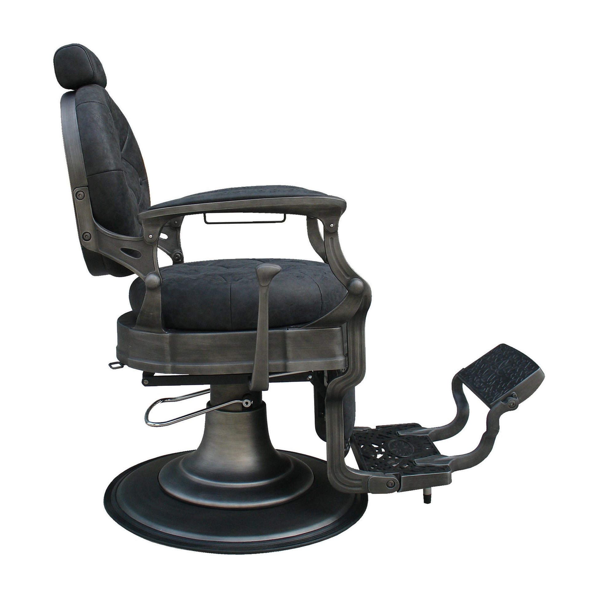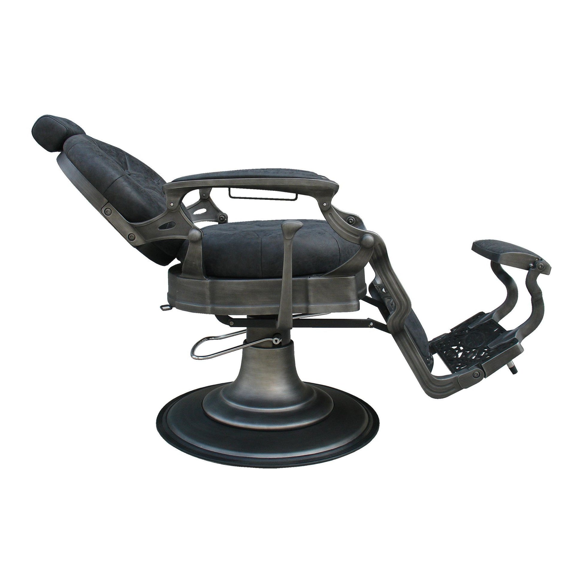 Sie werden keinen schöneren Friseurstuhl finden als den Clint. Die Looks der 40er und 50er Jahre, mit der Qualität und dem Komfort von heute. Wirklich wunderschön verarbeiteter Barberchair, der Ihrem Barbershop den Look verleiht, den Sie suchen. Der Clint ist mit einer abnehmbaren und höhenverstellbaren Kopfstütze ausgestattet. Für Rasurbehandlungen ist die Rückenlehne selbstverständlich neigbar. In einer wunderschönen verwitterten dunkelgrauen Farbe. Der Stuhl ist aus Aluminium gefertigt, was ihn außergewöhnlich leicht macht. Die Pumpe hat allerdings eine Tragfähigkeit von 300 Kilo. Das leichte Aluminium tut der Qualität also keinen Abbruch.
