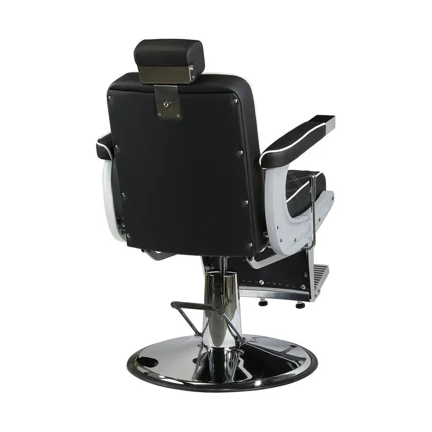Der schwarze Herrenstuhl Karl fällt durch seine schönen, unterschiedlichen weißen Nähte auf. Die schönen, klassischen rautenförmigen Nähte und Chromdetails versetzen Sie in den Barbershop der Fünfzigerjahre. Der Stuhl steht auf einem stabilen Trompetenfuß aus Chrom und ist von 52–66 cm höhenverstellbar. Die Rückenlehne ist neigbar und kann daher zum Rasieren und für Gesichtsbehandlungen nach hinten geneigt werden.