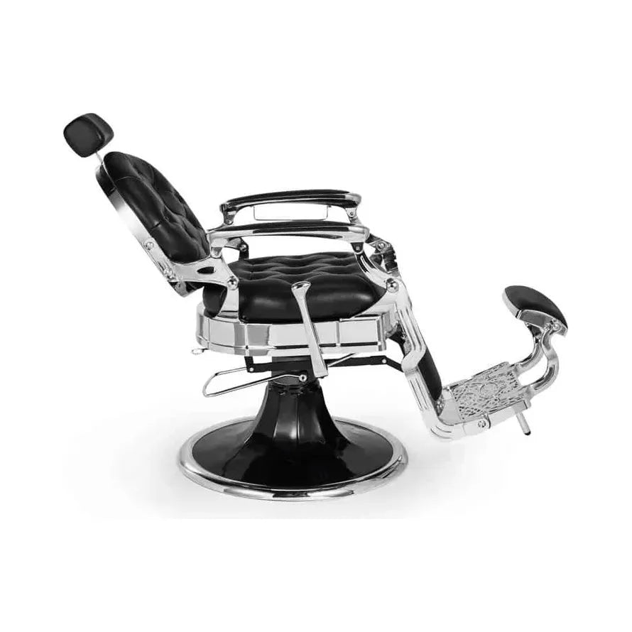 Sie werden keinen schöneren Friseurstuhl finden als den Kirk. Die Looks der 40er und 50er Jahre, mit der Qualität und dem Komfort von heute. Wirklich wunderschön verarbeiteter Barberchair, der Ihrem Barbershop den Look verleiht, den Sie suchen. Der Kirk ist mit einer abnehmbaren und höhenverstellbaren Kopfstütze ausgestattet. Für Rasurbehandlungen ist die Rückenlehne selbstverständlich neigbar. In einer schönen schwarzen Farbe mit Chromarmlehnen und -gestell. Der Stuhl ist aus Aluminium gefertigt, was ihn außergewöhnlich leicht macht. Die Pumpe hat allerdings eine Tragfähigkeit von 300 Kilo. Das leichte Aluminium tut der Qualität daher keinen Abbruch.