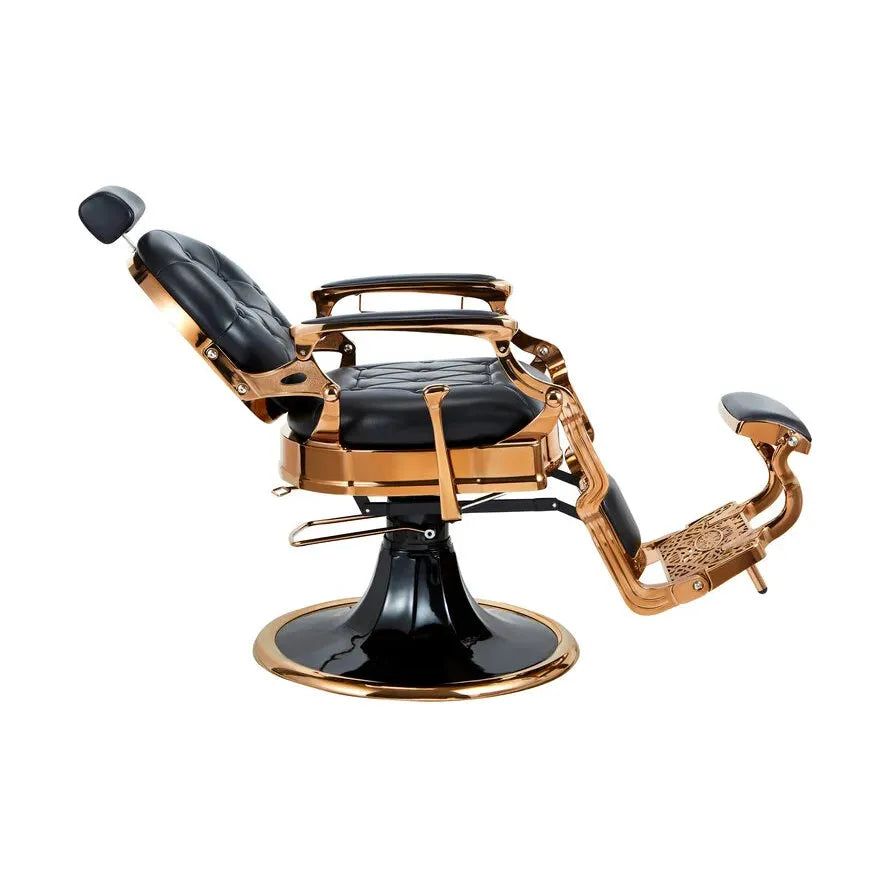 Sie werden keinen schöneren Friseurstuhl finden als den Kirk. Die Looks der 40er und 50er Jahre, mit der Qualität und dem Komfort von heute. Wirklich wunderschön verarbeiteter Barberchair, der Ihrem Barbershop den Look verleiht, den Sie suchen. Der Kirk ist mit einer abnehmbaren und höhenverstellbaren Kopfstütze ausgestattet. Für Rasurbehandlungen ist die Rückenlehne selbstverständlich neigbar. In einer schönen schwarzen Farbe mit goldenen Armlehnen und schwarz/goldenem Sockel. Der Stuhl ist aus Aluminium gefertigt, was ihn außergewöhnlich leicht macht. Die Pumpe hat allerdings eine Tragfähigkeit von 300 Kilo. Das leichte Aluminium tut der Qualität daher keinen Abbruch.