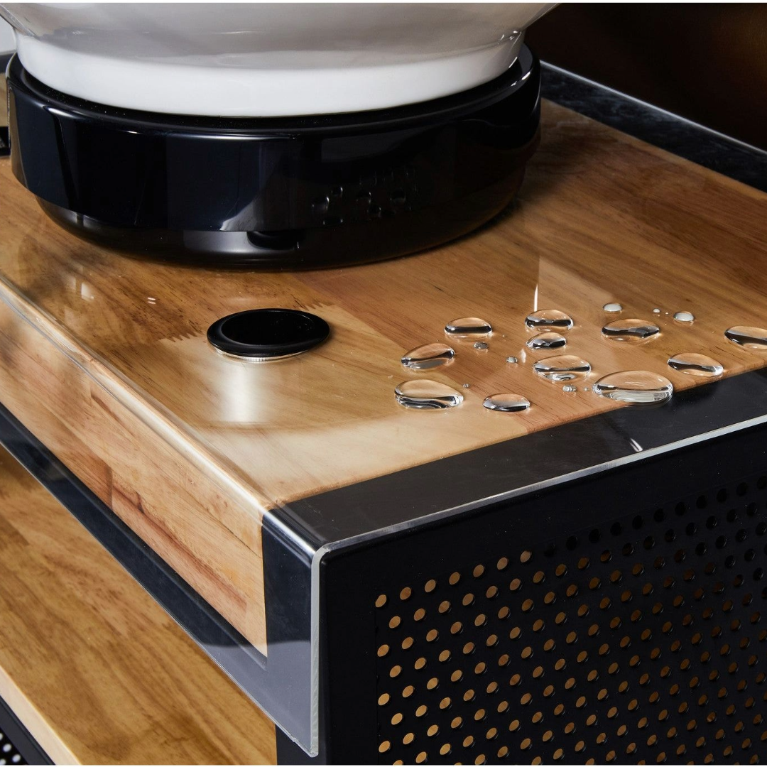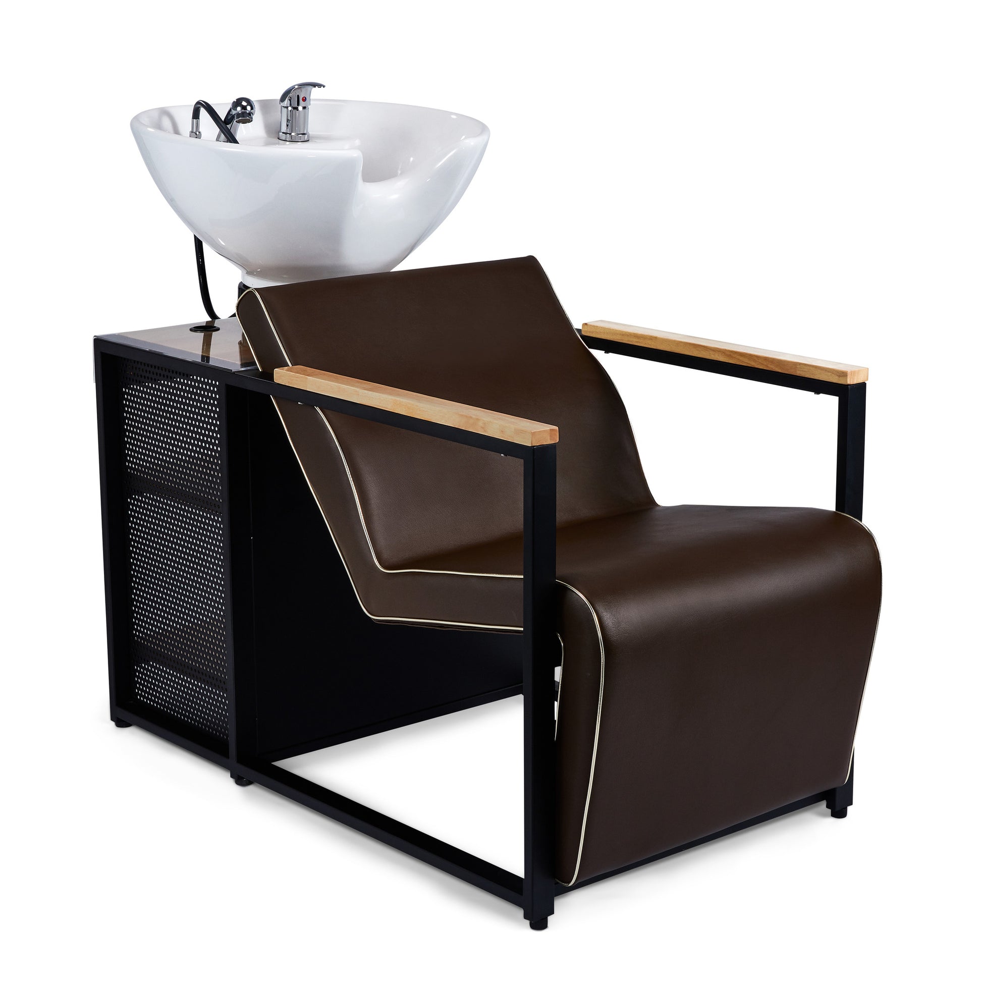 Wunderschöne Waschanlage im Industrie-Look aus der neuen Organic-Kollektion des spanischen Herstellers Mirplay. Rahmen aus verzinktem schwarzem Stahl. Herrlich geräumige Sitzfläche auf dem braunen Skai-Ledersessel. Der Stuhl hat einen kontrastierenden Goldbesatz. Armlehnen und Regale aus massiver Eiche. Die Ablage, die das Waschbecken trägt, ist durch eine Acrylglasplatte geschützt, sodass eventuelles Wasser dem Holz keinen Schaden zufügt. Waschbecken aus weißer Keramik. kippbar und ausgestattet mit Mischbatterie, Handbrause und Abfluss.