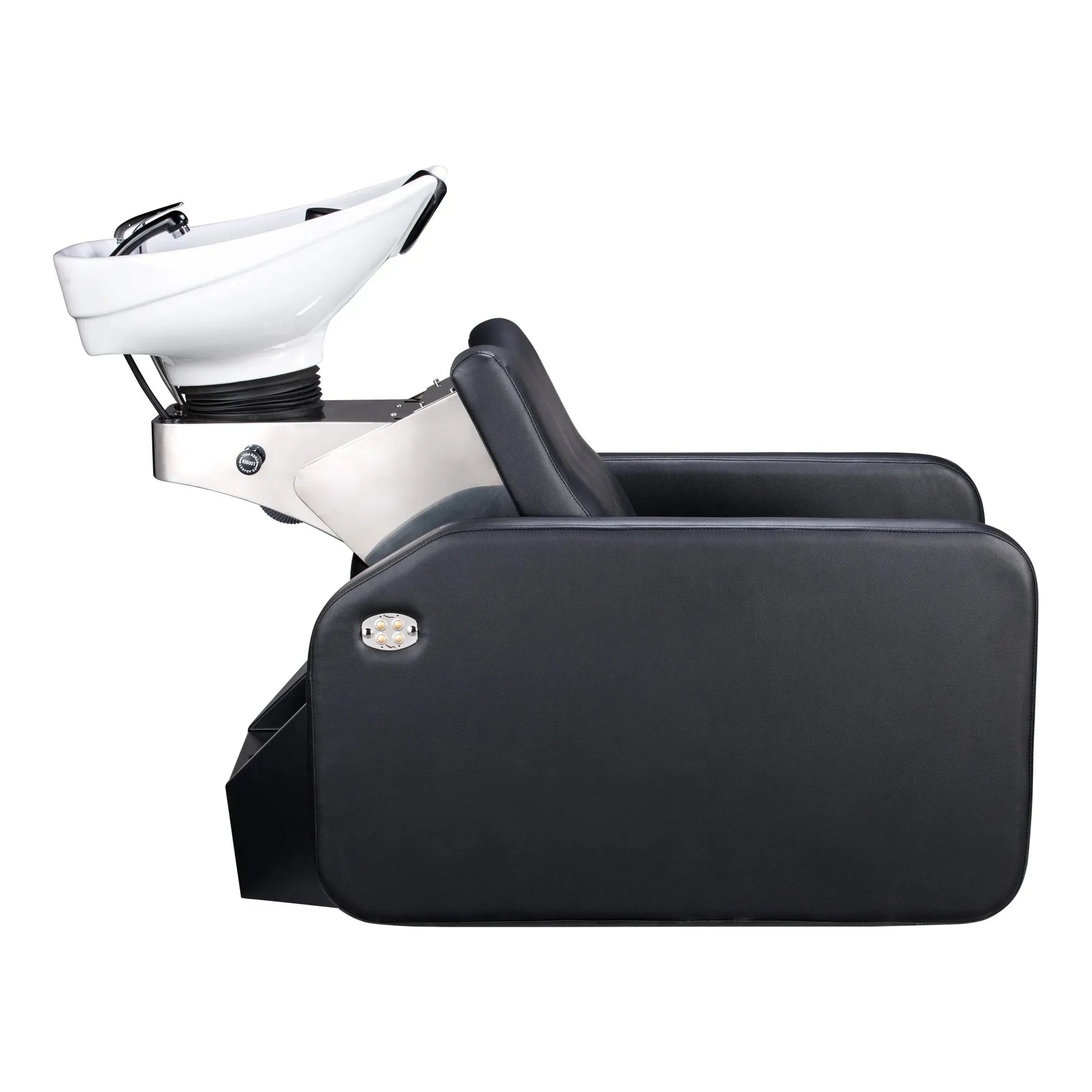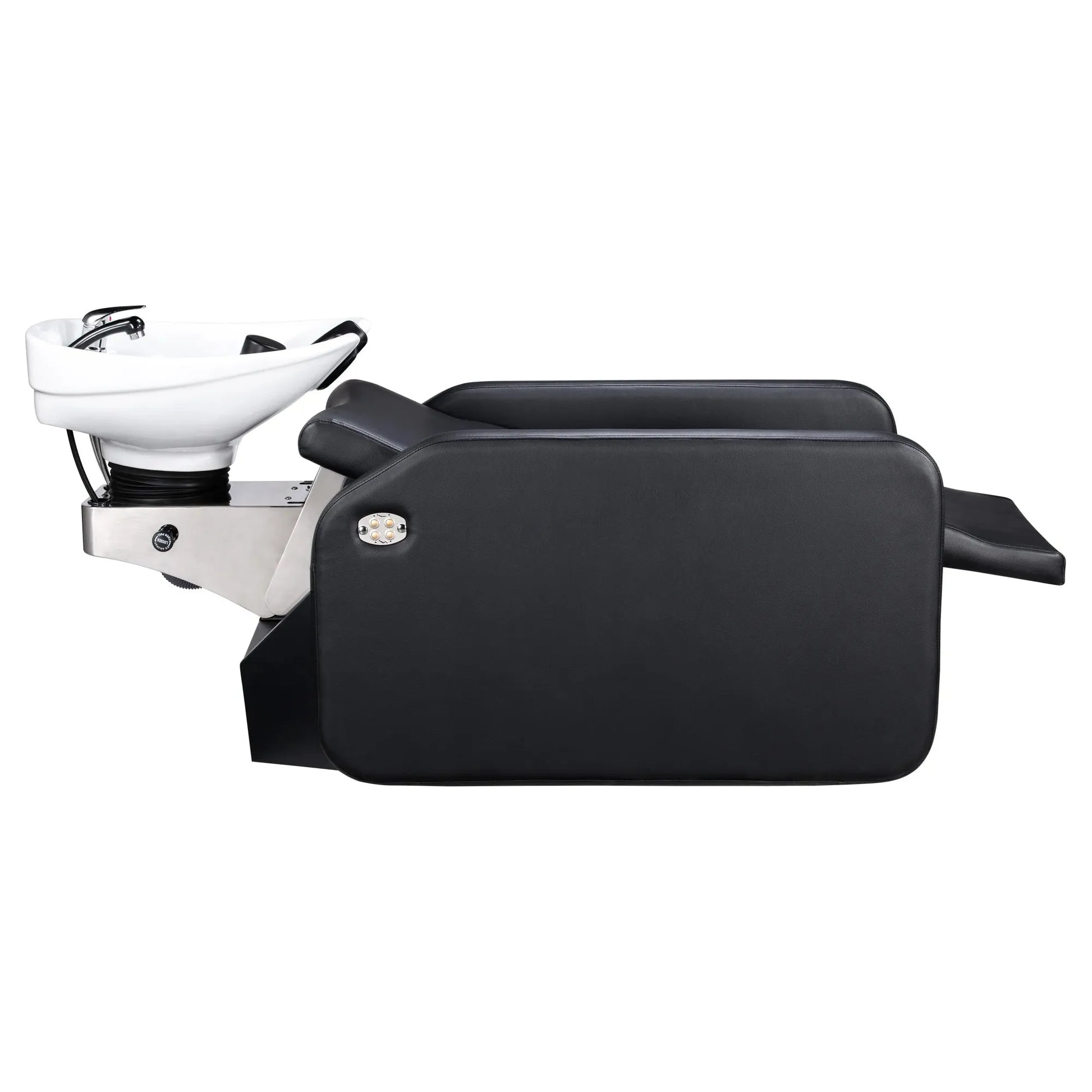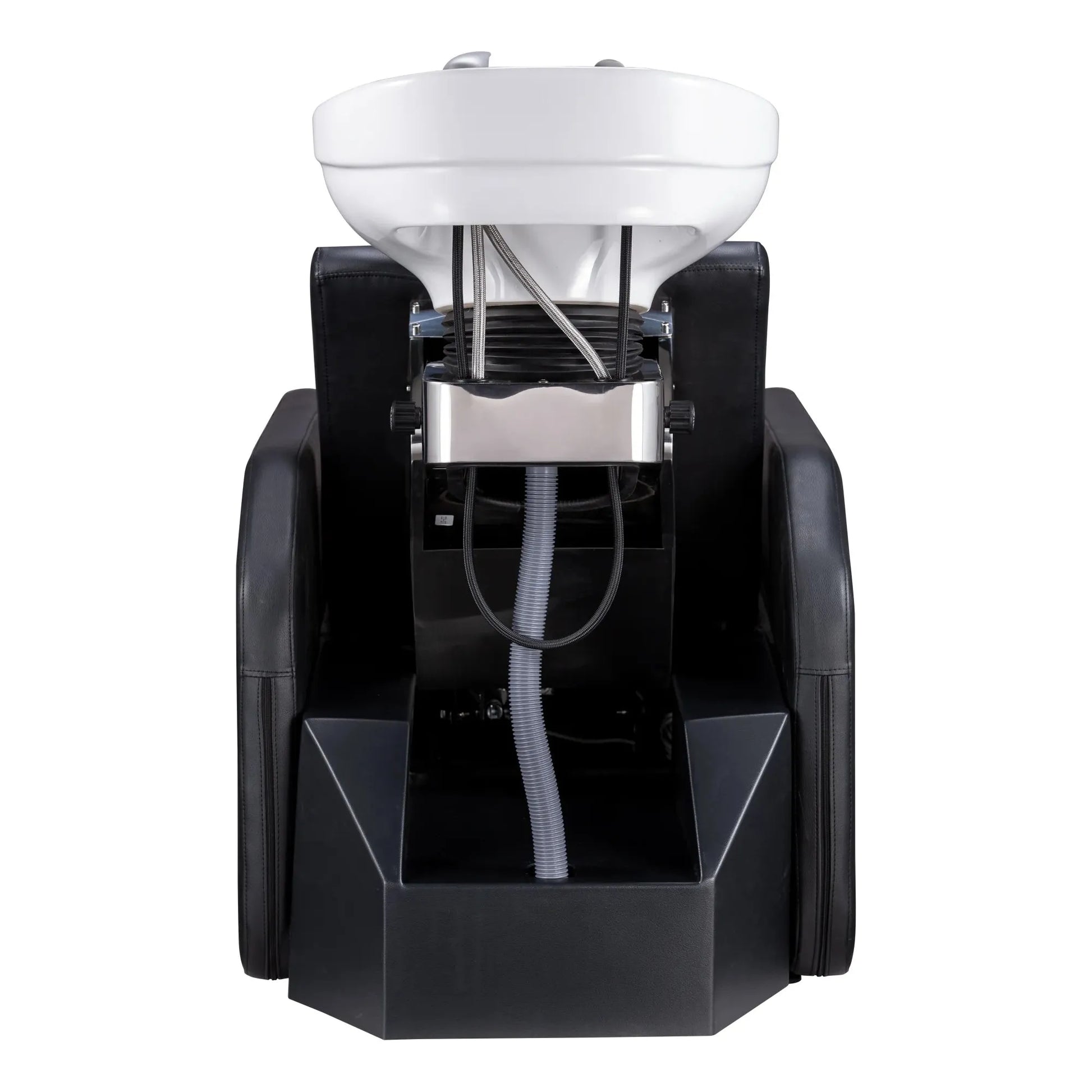 Rückseite aus Metall. Der Stuhl ist mit feuerbeständigem schwarzem Kunstleder bezogen. Weißes Waschbecken mit Auffangschale für Haare. Der Wasserhahn ist neigbar und verfügt über einen Wasserstopp, um ein Auslaufen zu verhindern.