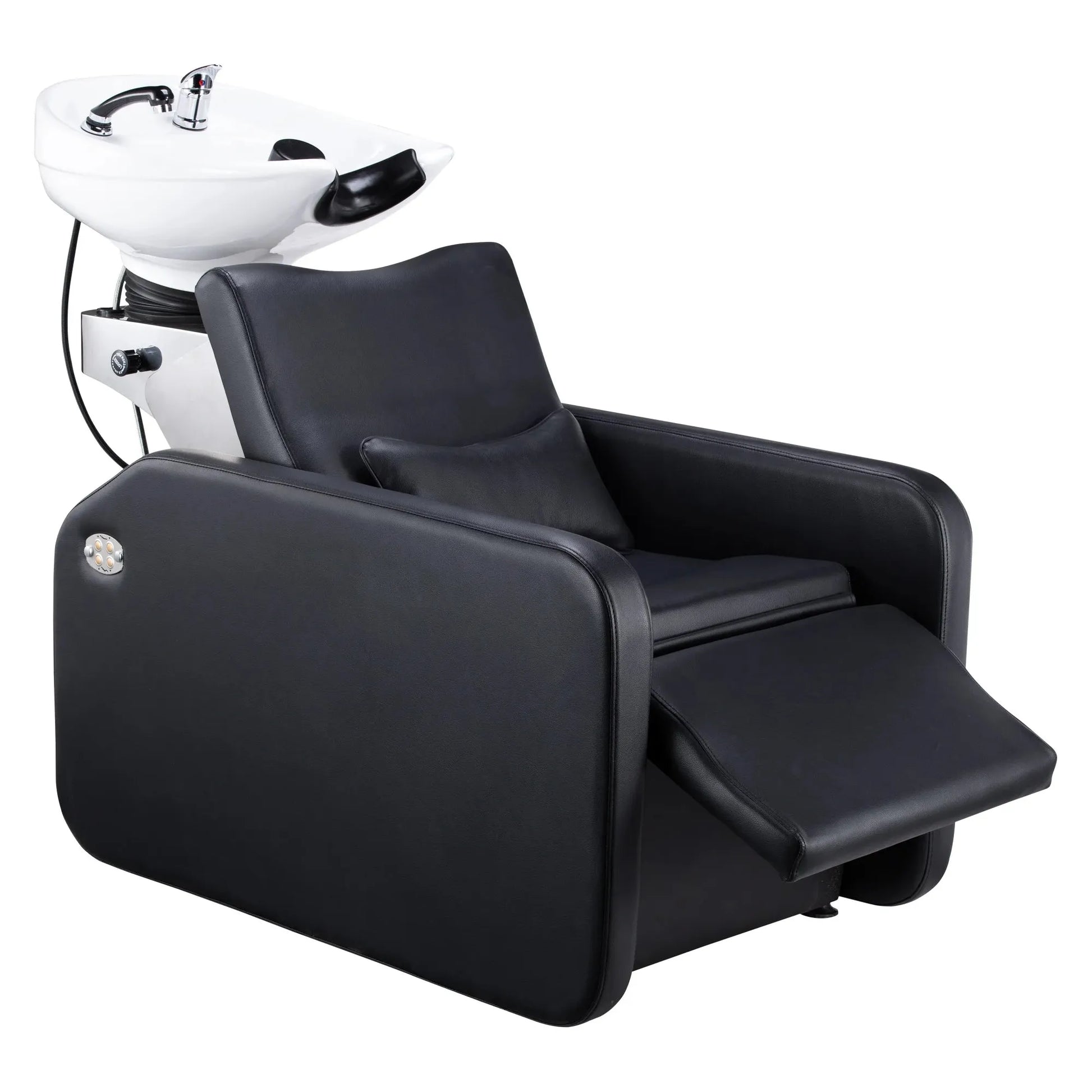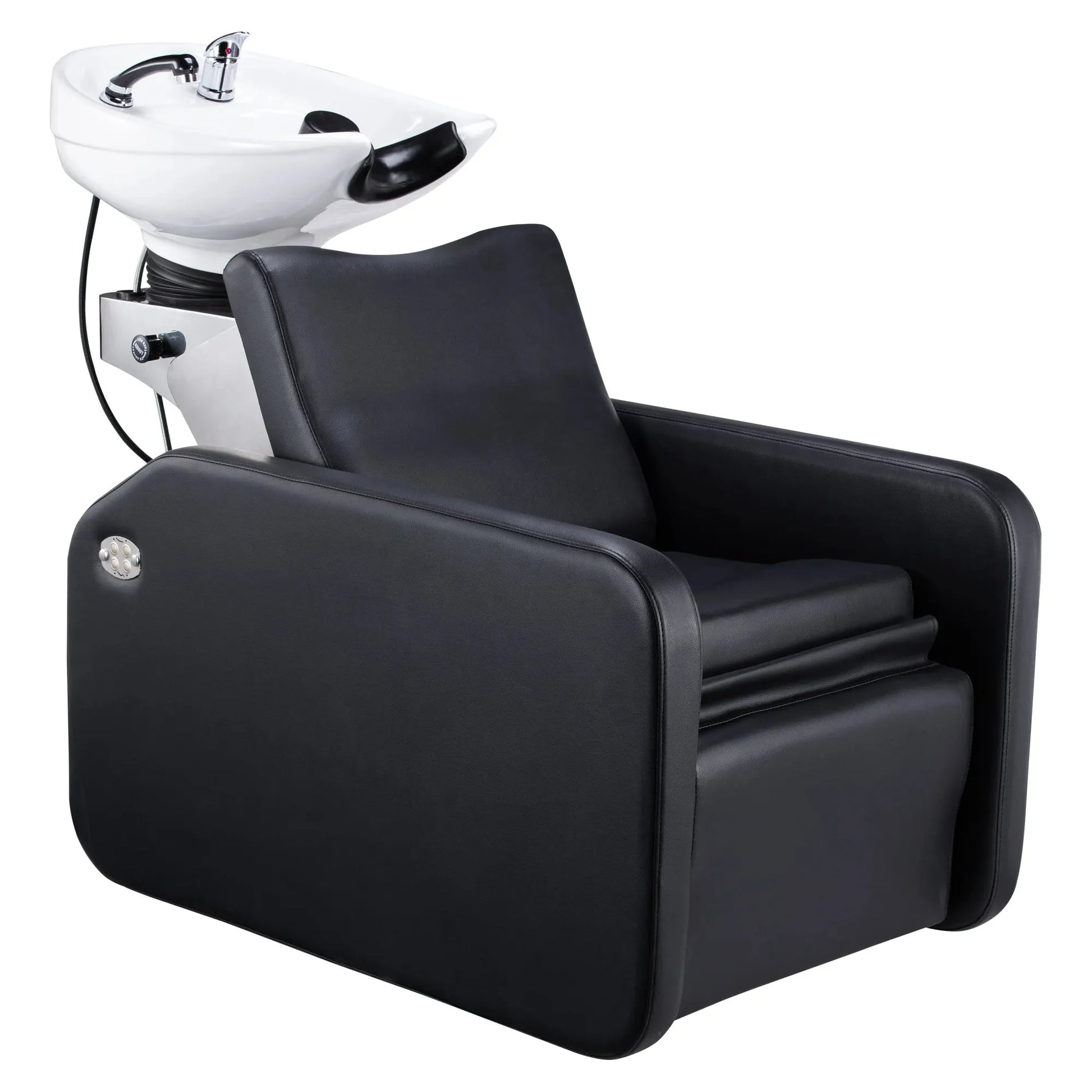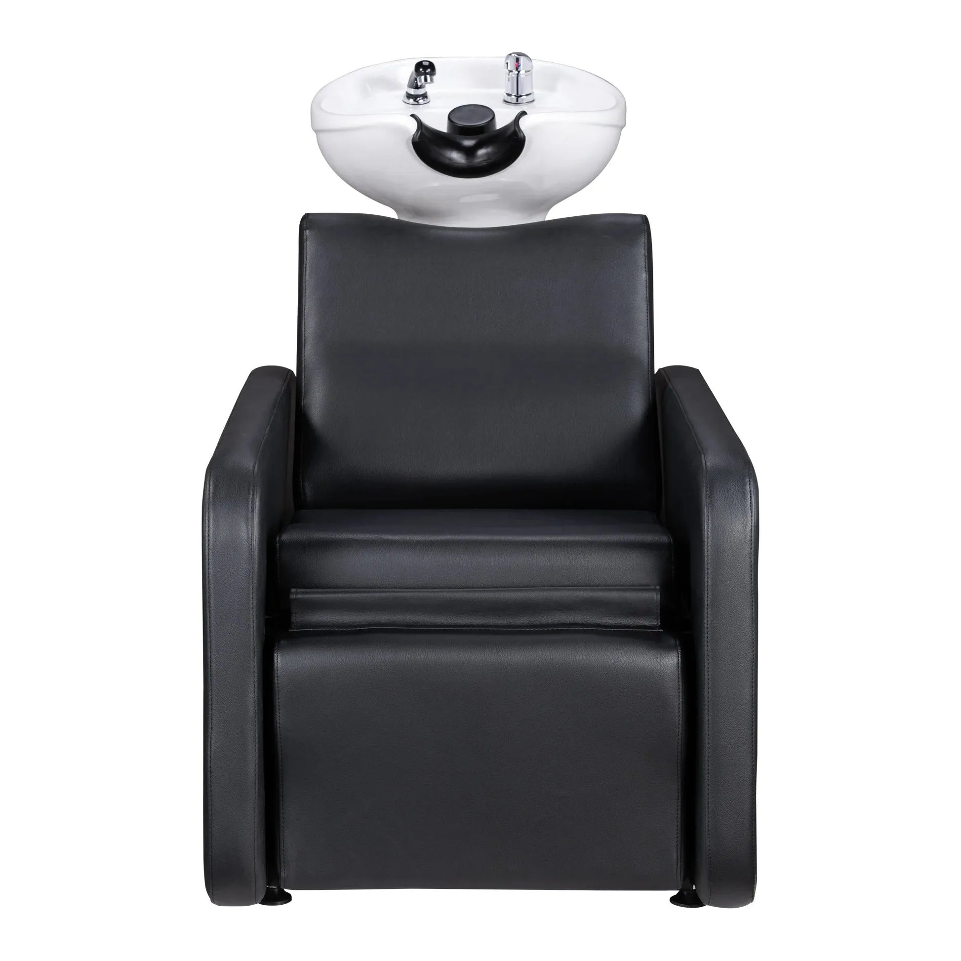 Rückseite aus Metall. Der Stuhl ist mit feuerbeständigem schwarzem Kunstleder bezogen. Weißes Waschbecken mit Auffangschale für Haare. Der Wasserhahn ist neigbar und verfügt über einen Wasserstopp, um ein Auslaufen zu verhindern.