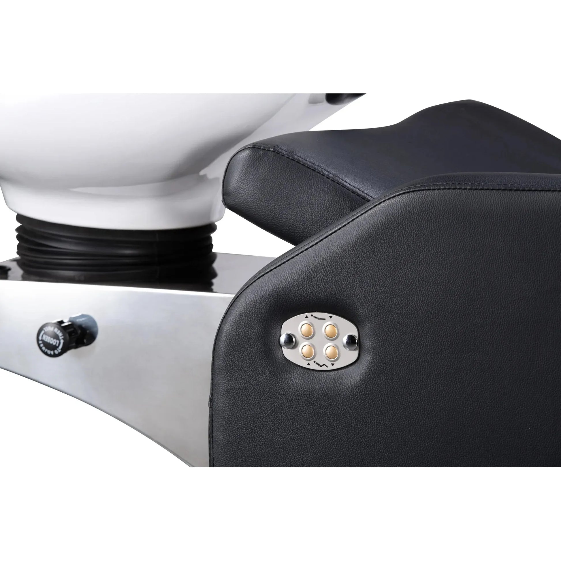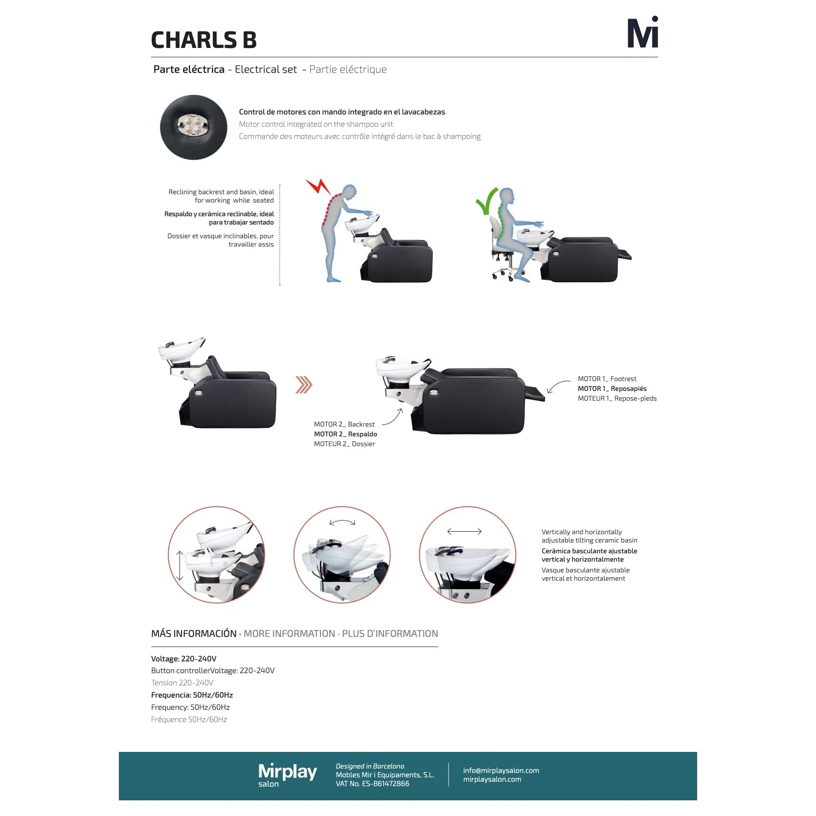 Schöne ergonomische Wascheinheit vom spanischen Mirplay. Revolutionäre Technik, denn der Charly ist stufenlos höhenverstellbar. Keine Rückenprobleme mehr, sowohl die größeren als auch die kleineren Friseure arbeiten sehr angenehm. Das Waschbecken ist zudem kippbar. Sitzen auf einem Hocker während einer Waschbehandlung möglich. Der Stuhl kann nahezu vollständig horizontal stehen, damit der Kunde ihn in vollen Zügen genießen kann. Der Charly verfügt über zwei Motoren, einen für die Beinstütze und einen für die Rückenlehne.