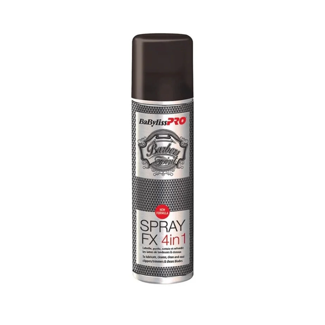 Houd uw apparatuur in topconditie met de BaBylissPRO Spray FX 4-in-1 Barber Edition – snel, effectief en onmisbaar in elke kapperskit.