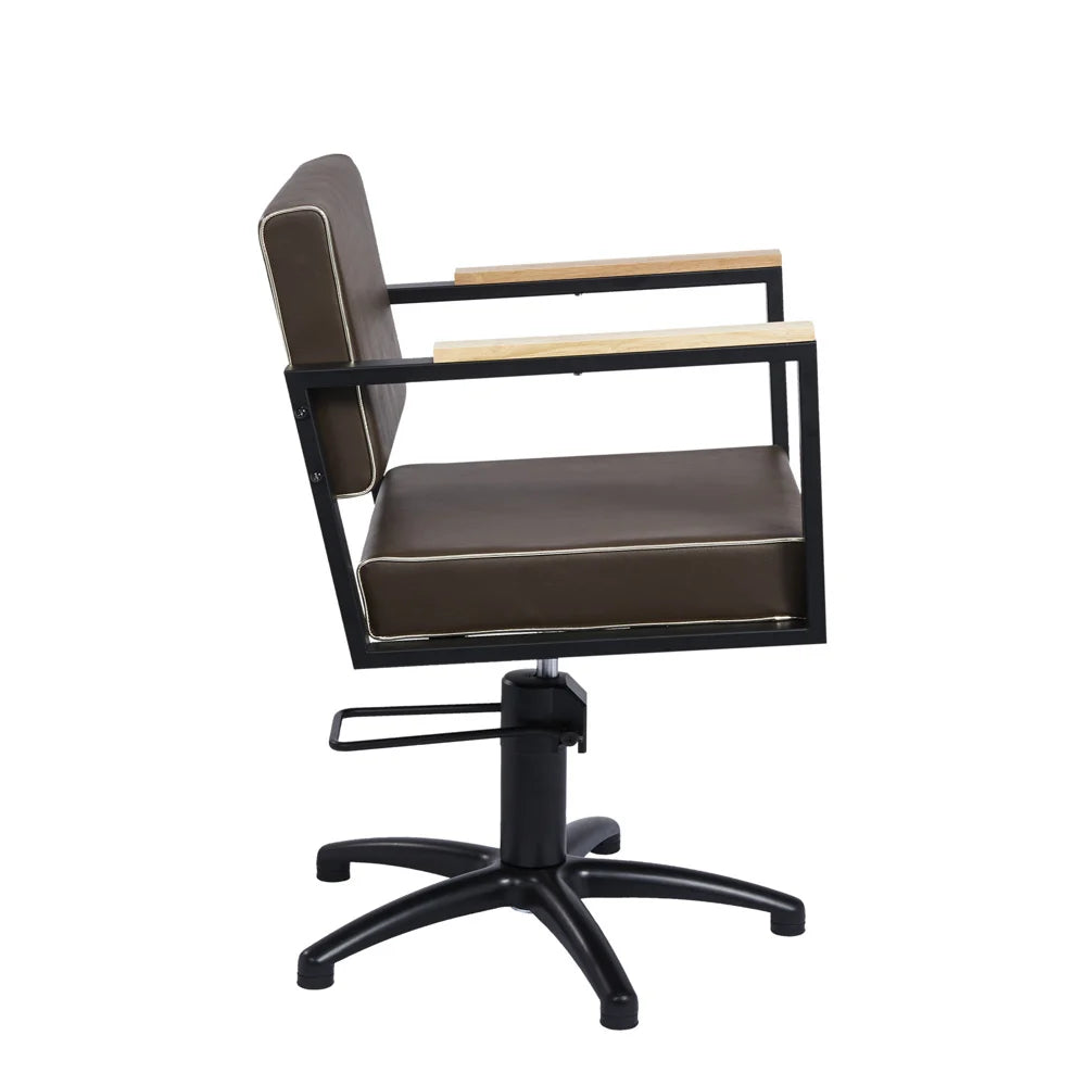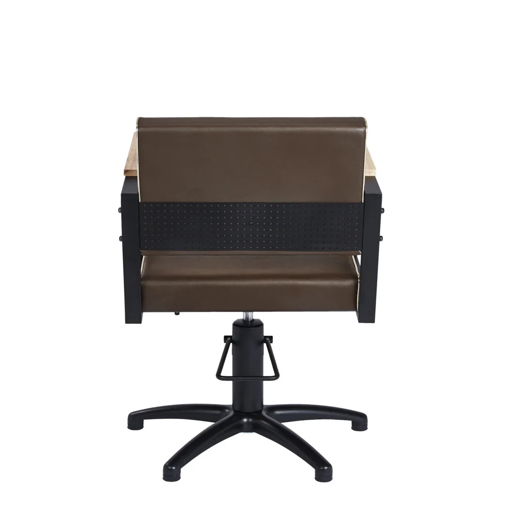 Prachtige Industriële Kappersstoel van het Spaanse Mirplay. Bruine Skai Bekleding met een Gouden Piping. Zwart buisvormig frame en op een zwarte aluminium stervoet. Beukenhouten armleuningen. Hoogte verstelbaar van 48-60cm. Ga je voor een Industriële "Vintage" look in je salon? Dan is dit jouw stoel.