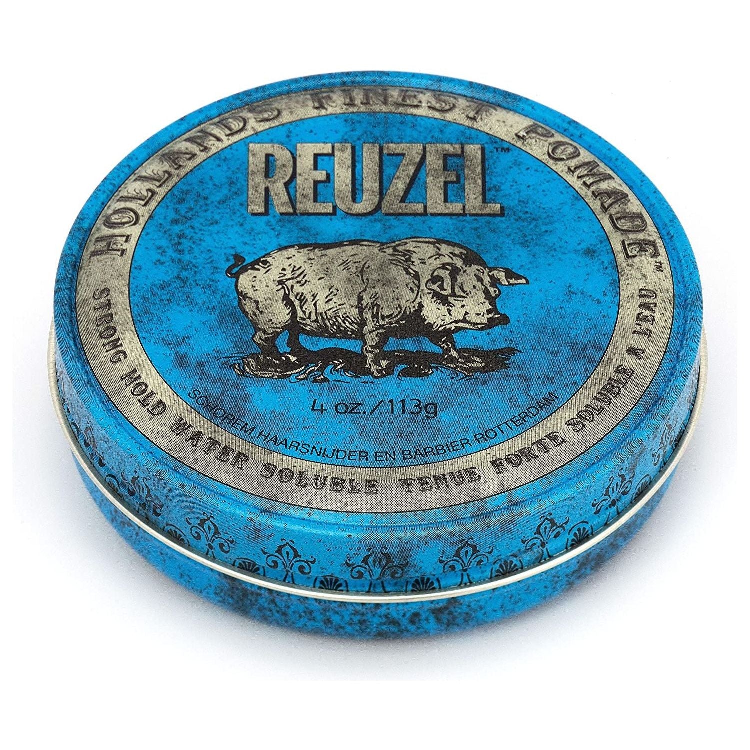 The Blue Strong Hold Pomade packaging is the strongest water-based Pomade from Reuzel.